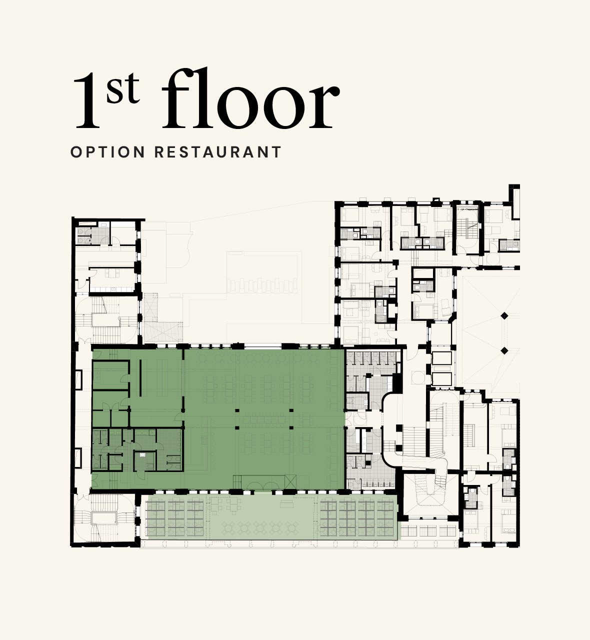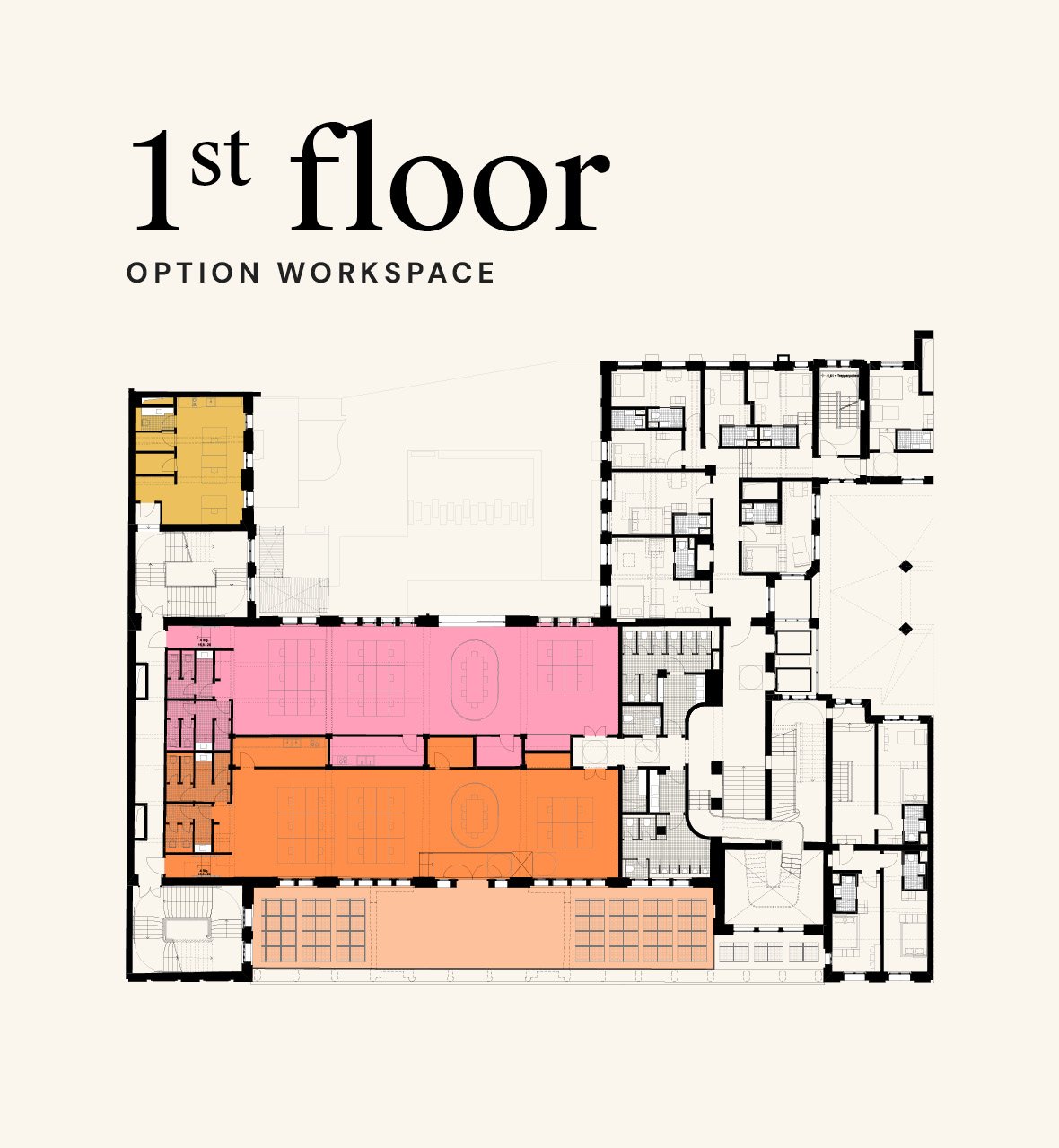 Restaurant, bar, yoga, kiosk, retail, workspaces